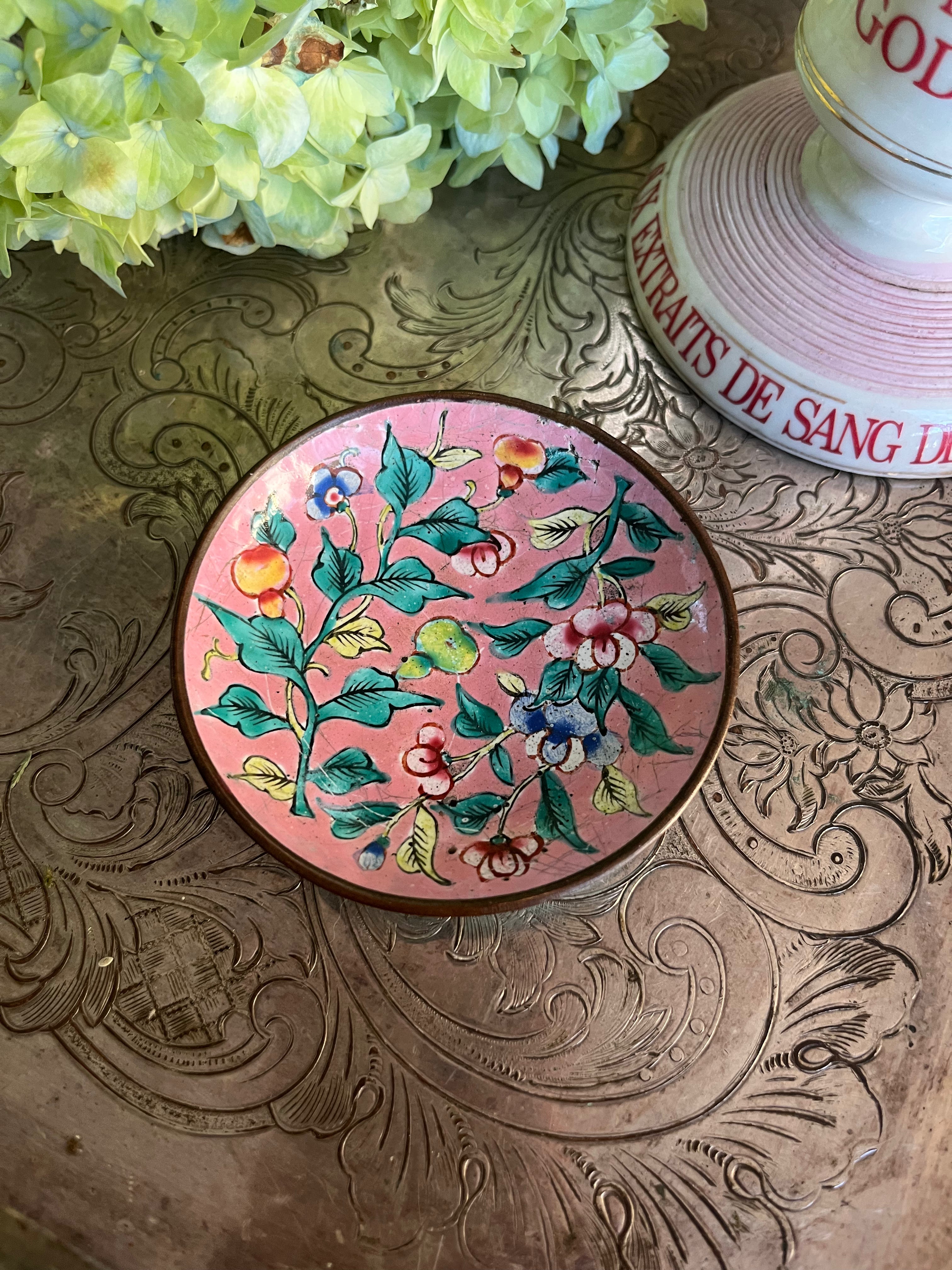 Darling Pink and Aqua Enameled Brass Small Plate with colorful Flowering branches. Gorgeous with vibrant colors - such a versatile, classic piece!