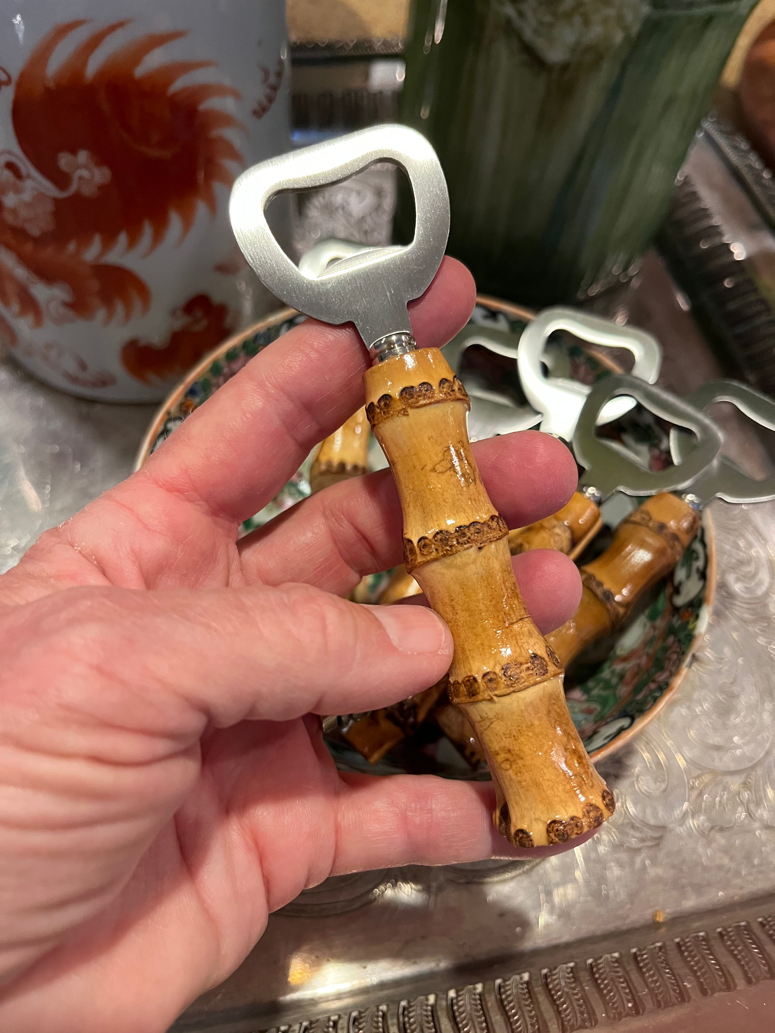 Cute bamboo handle bottle openers perfect for a Bar Cart! These openers are 5” long and have a stainless steel head. Imported.