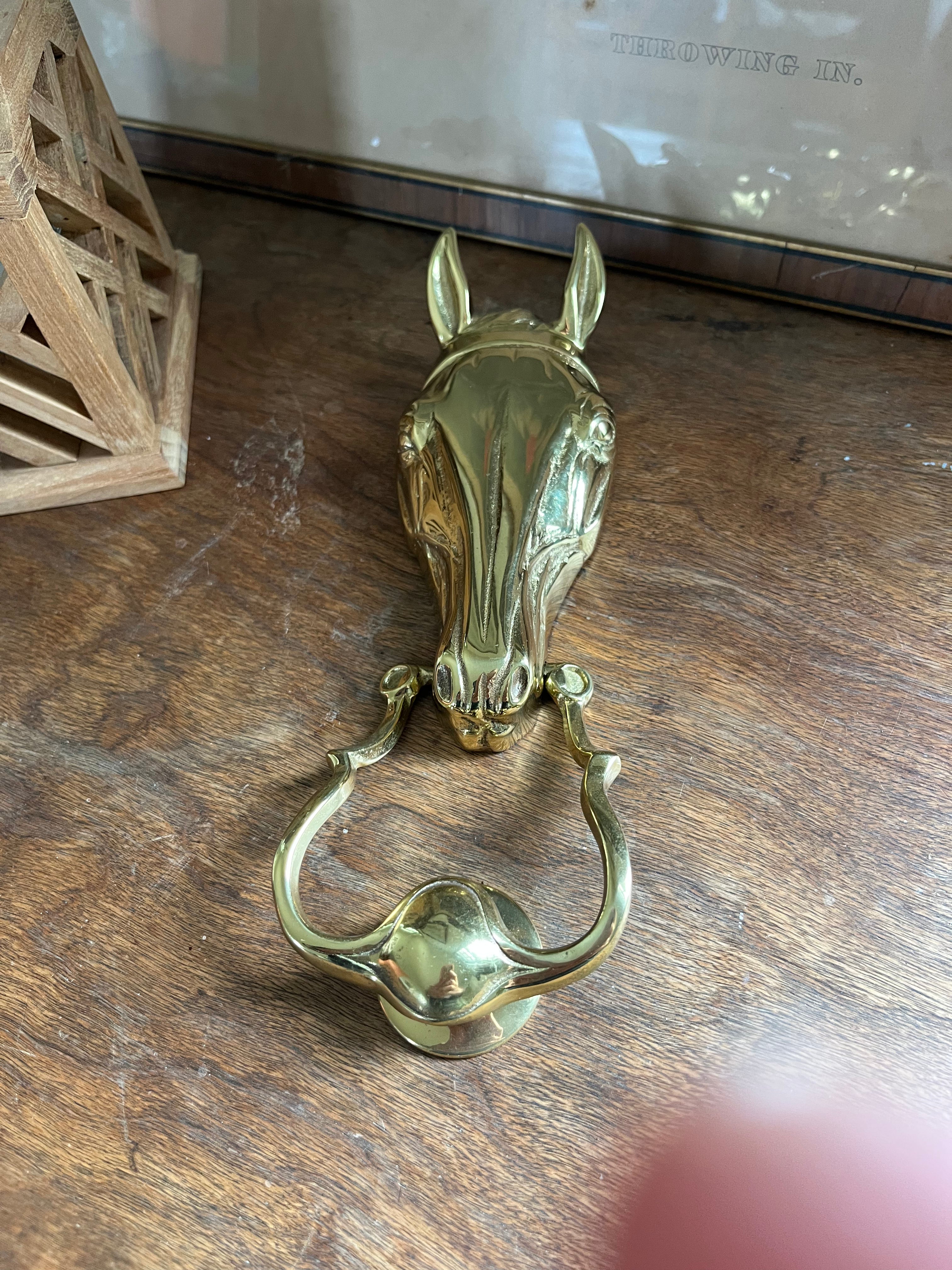 Add a touch of vintage elegance to your home with this solid brass horse head door knocker, created by VA Metalcrafters in 1949. Crafted from high-quality brass, this horse head door knocker is perfect for any door, adding a unique and stylish touch to your entrance. The brass material ensures that this door knocker will stand the test of time, remaining as beautiful as the day it was created. The intricate details of the horse head will catch the eye of any visitor, making this an excellent conversation starter for your home. Make a statement with this beautiful vintage original door knocker, perfect for any lover of antique hardware.