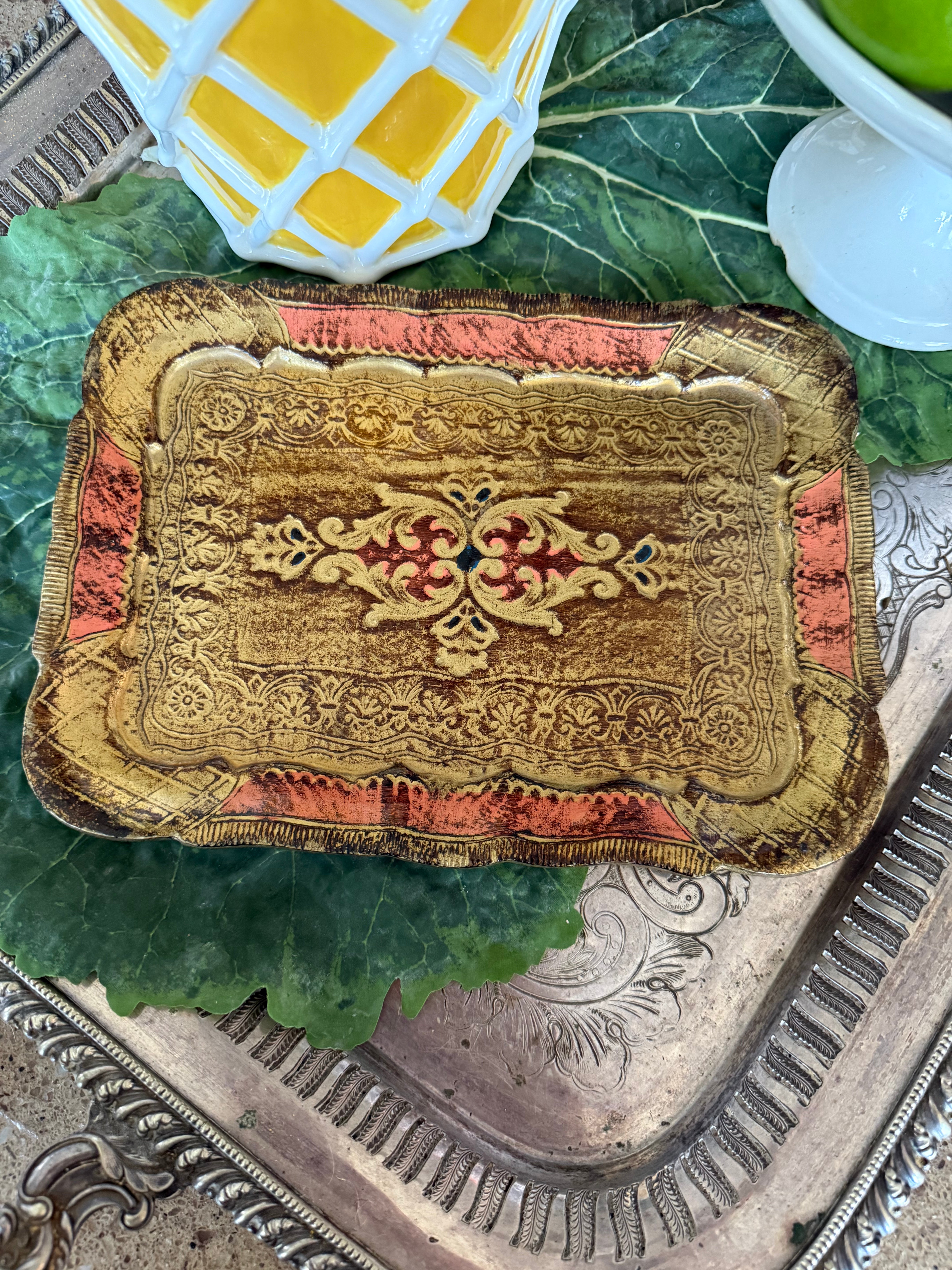 This beautiful Florentine tray measures 10 1/4 inches long, and 7 1/2 inches wide. It is an excellent condition with lovely shades of pinky peach and gold. Perfect on a dresser, holding perfume bottles or on a desk with desk accessories.