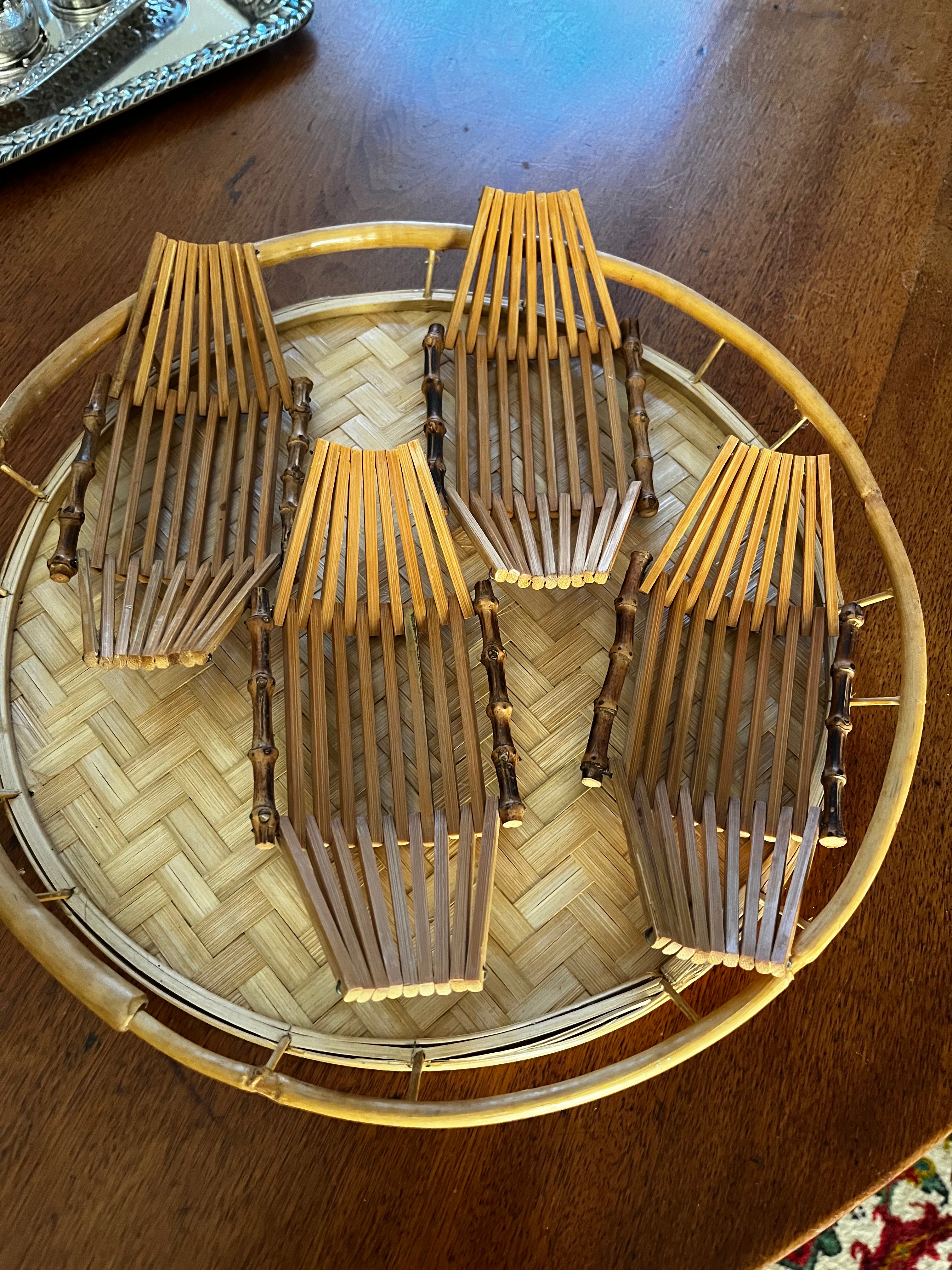 This set of 4  vintage Japanese bamboo wet towel trays are known as Oshibori-Oki.