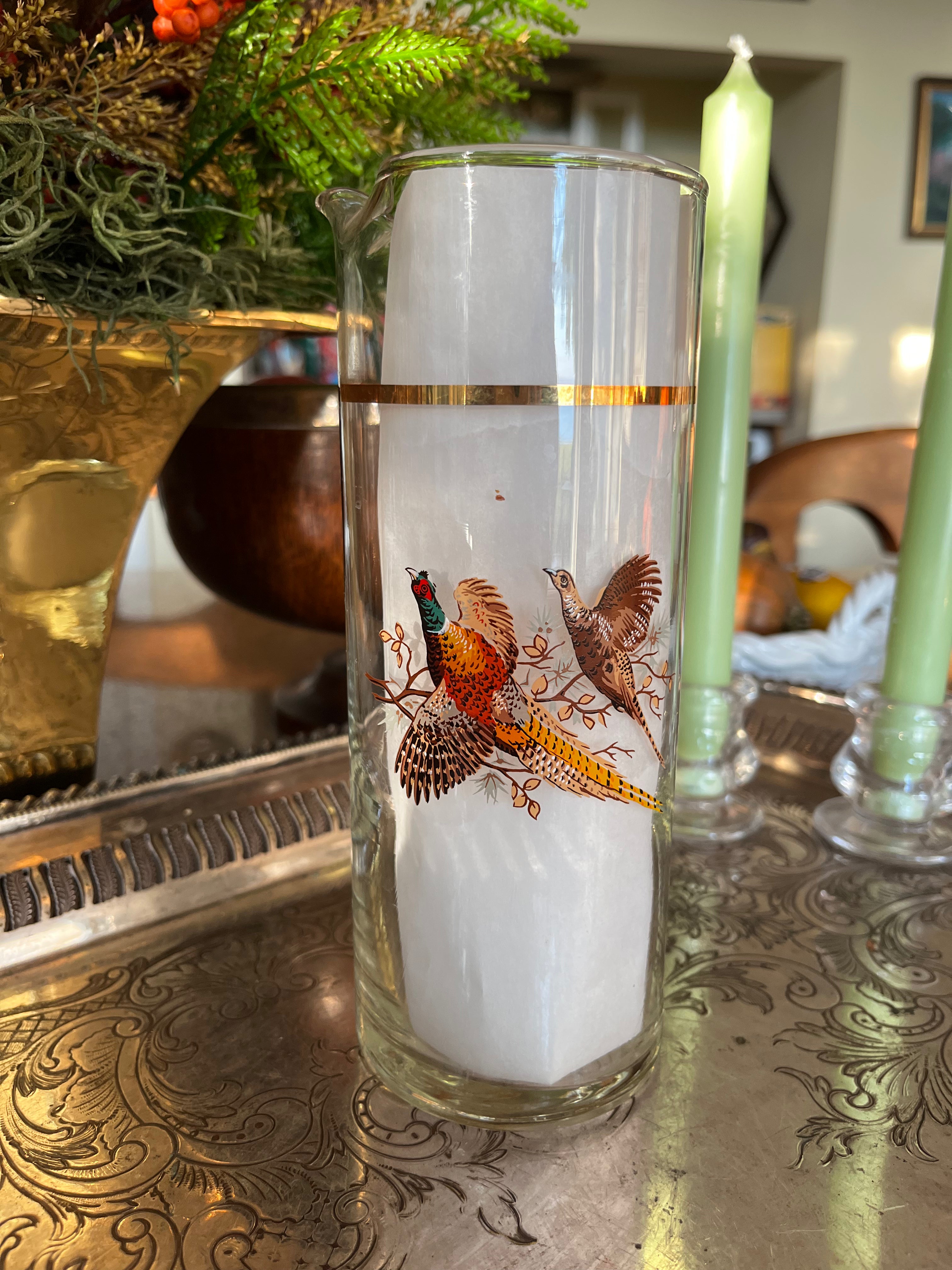The pitcher is adorned with a pair of Pheasants landing on a branch and there is a gold ring around the pitcher above the birds.