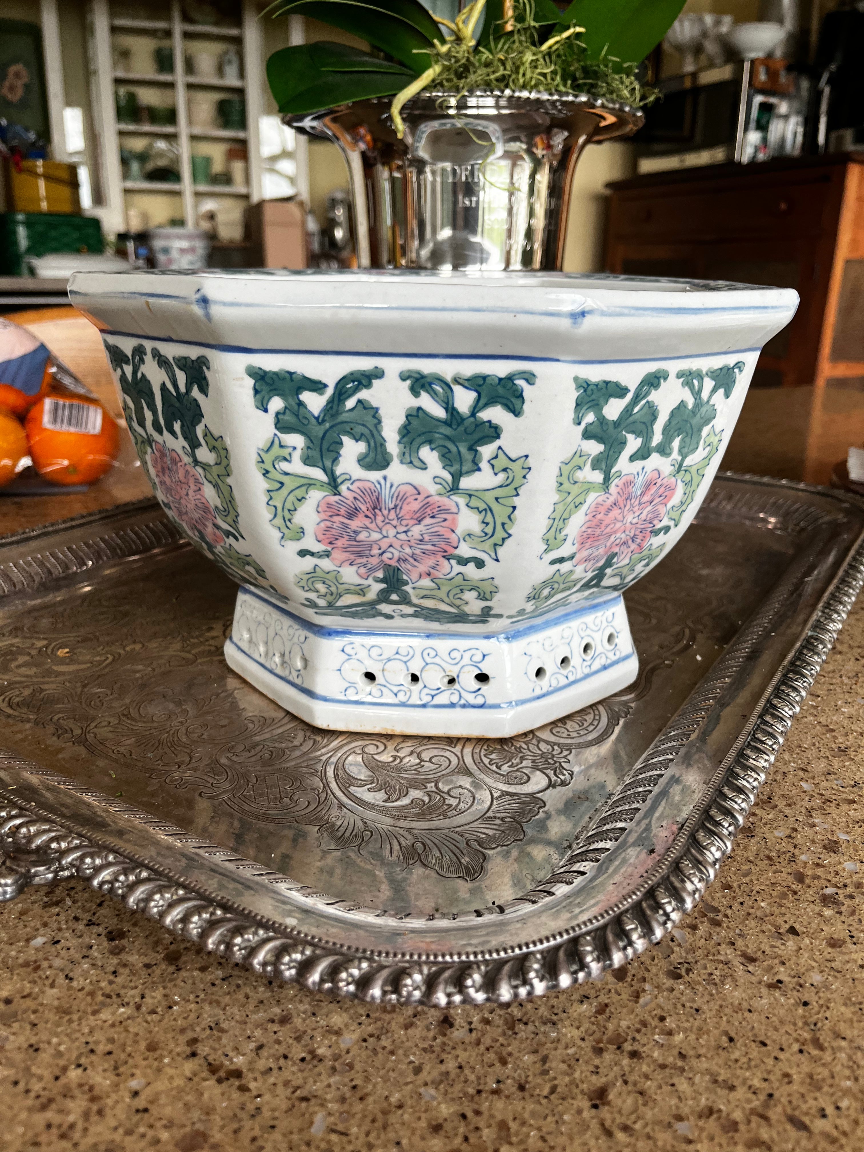 This gorgeous planter measures 7 inches tall and 12 inches in diameter. It has a hole drilled in the bottom for drainage and is in excellent condition with no chips or cracks.