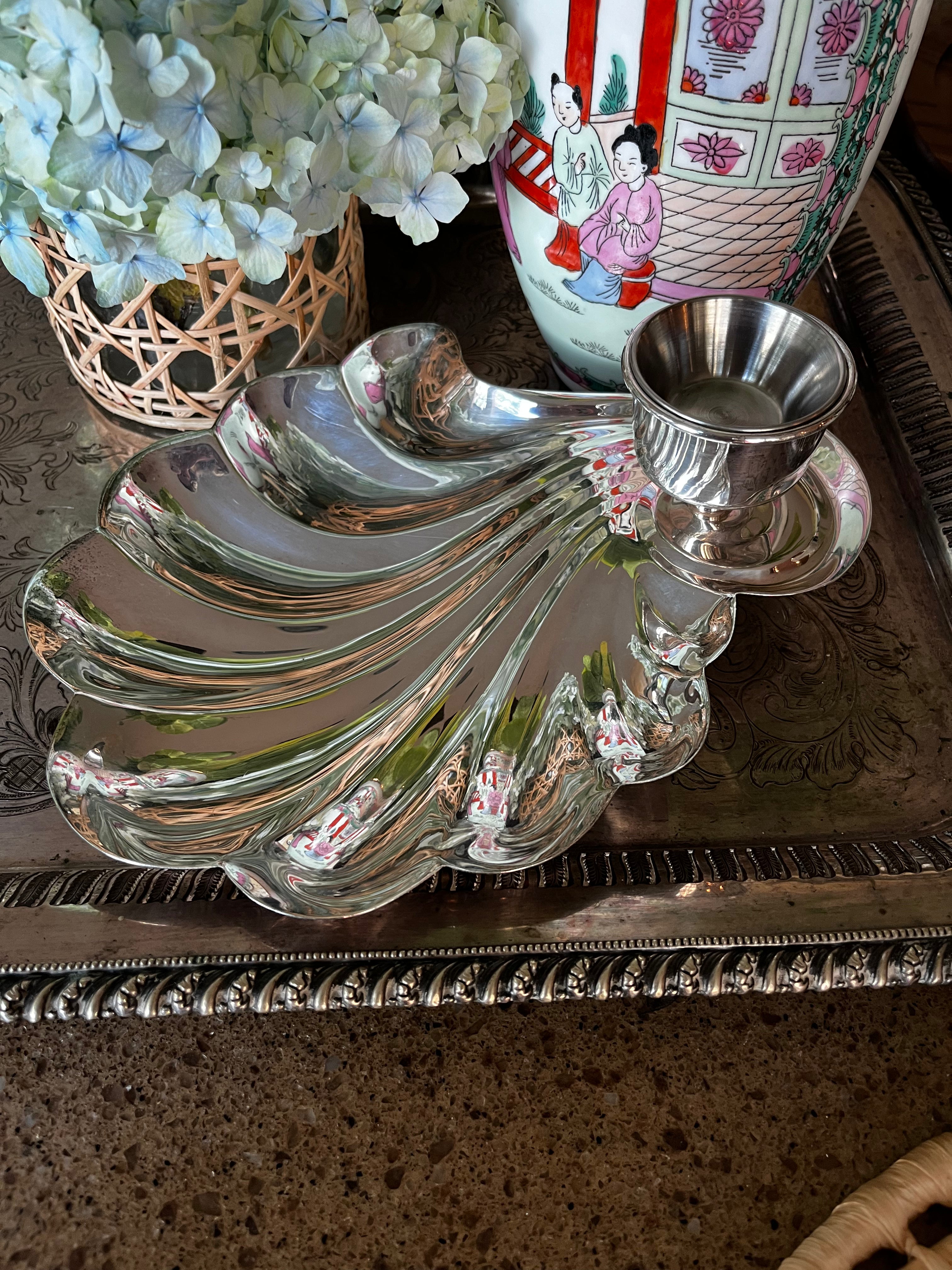 Darling smaller size silver plate server in a stylized clam shell pattern. This server is in excellent condition with minor scuff marks and no dents or deep scratches!
