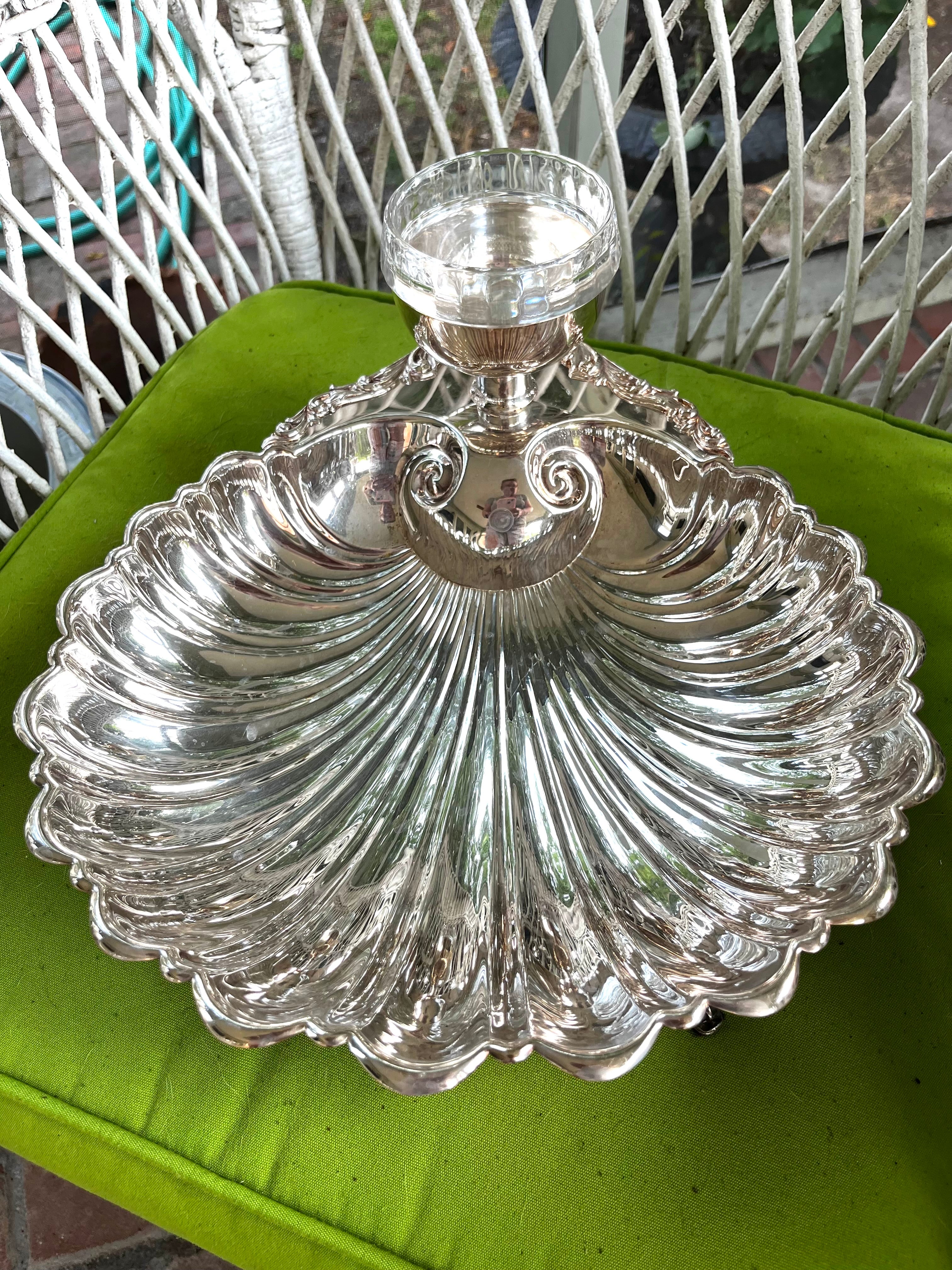 Here’s a wonderful vintage silver plate shell server. It measures 12 inches wide, 13 inches long and 6 inches tall. It has darling Koi fish feet. There is a glass insert that’s perfect for cocktail sauce or Remoulade sauce.