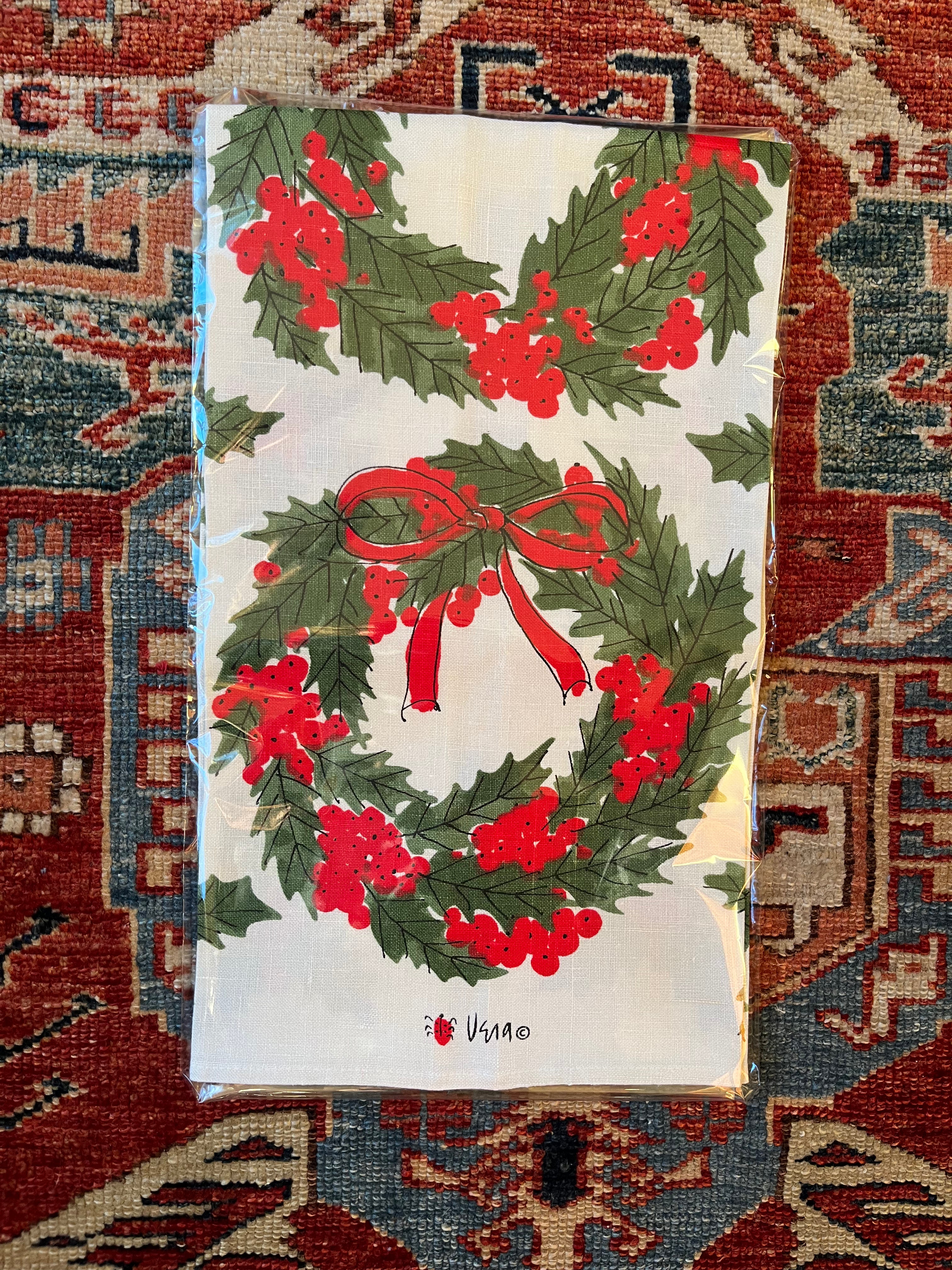 Bring Vera Neumann to your kitchen and you have instant mid-century design! Three holly wreaths in a row make up the design on this Tea towel. The design is two directional with Vera's signature on both ends. The center wreath is without a bow. The colors are rich and clear!
